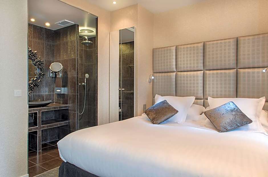 Large room with a Palace quality bed of King Size 180x200. Very comfortable room with a trendy and original decoration composed of either a Napoleon III style bathtub, or a luxury Himalayan slate shower.